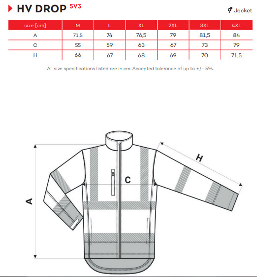 • tanúsítvány az EN ISO 20 471 (2. osztály - M, L; 3. osztály - XL - 4XL) és EN ISO 13 688 szabványok szerint