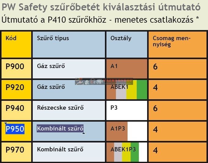 ABEK1P3 kombinált szűrő, mely véd szerves és szervetlen savas gázok és gőzök, kén-dioxid, ammónia és származékai ellen. Védelmet nyújt továbbá káros anyagok, oldószerek, mérgező részecskék és mikroorganizmusok ellen. Csak párban lehet használni, a P410 félálarccal kompatibilis.